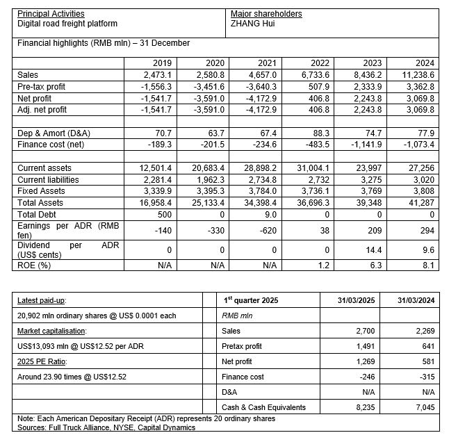 This week, i Capital updates Full Truck Alliance (FTA) (满帮集团), a leading digital road freight platform in China that connects shippers with truckers to facilitate shipments. To recap, the Company is the result of a merger in 2017 between Yunmanman (运满满) and Huochebang (货车帮), which were established in Jiangsu province in 2013 and Guizhou province in 2011 respectively, operating mobile apps for freight information listing. It was listed on the New York Stock Exchange in Jun 2021, and has over 7,000 employees by end of 2024. Subscribers who followed our buy call on the stock in May 2024 are sitting on a comfortable profit of 38%.