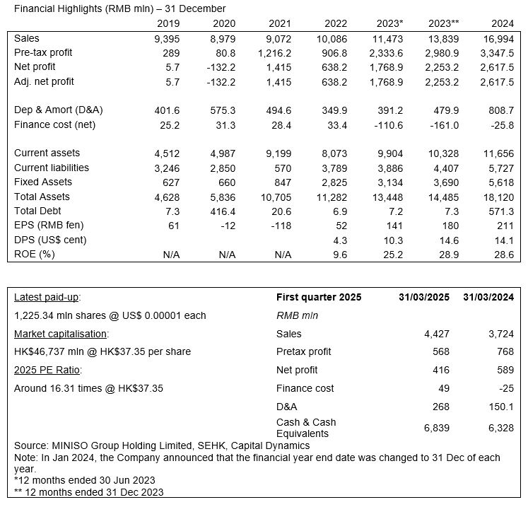 This week, i Capital updates MINISO Group Holding Limited (名创优品) (MINISO), a leading global value retailer offering a variety of trendy lifestyle products featuring IP design. The Company opened its first store in 2013 in China under the brand “MINISO”. As of the end of Mar 2025, the Company had a network of 7,488 MINISO stores, of which around 4,275 were in China and around 3,213 were overseas. Thanks to the thriving pop toy market, its network of “TOP TOY” stores had expanded to 280 outlets as of the end of Mar 2025 from the 160 of the corresponding period in 2024.